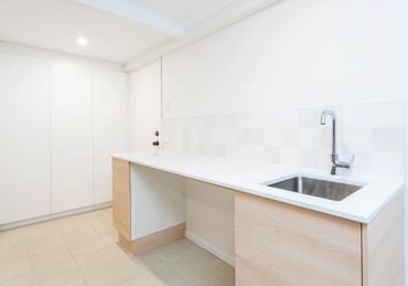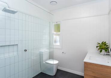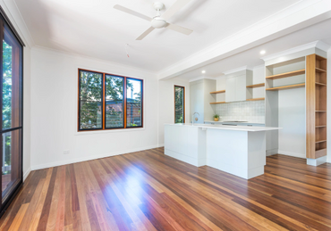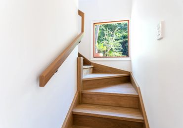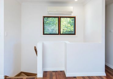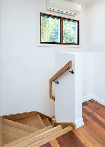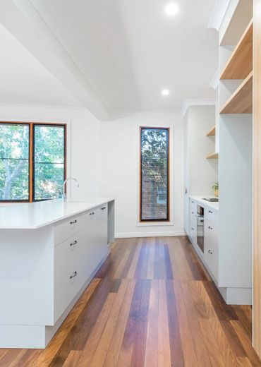 This project was a full two-storey renovation that included joining the upstairs living with the downstairs living with Australian spotted gum internal stairs. Removed walls and doors to allow a more free-flowing home. Reconfigured the two bathrooms for a more modern feel, installed a new kitchen and new windows throughout to take advantage of the leafy aspect of Outlook Crescent.